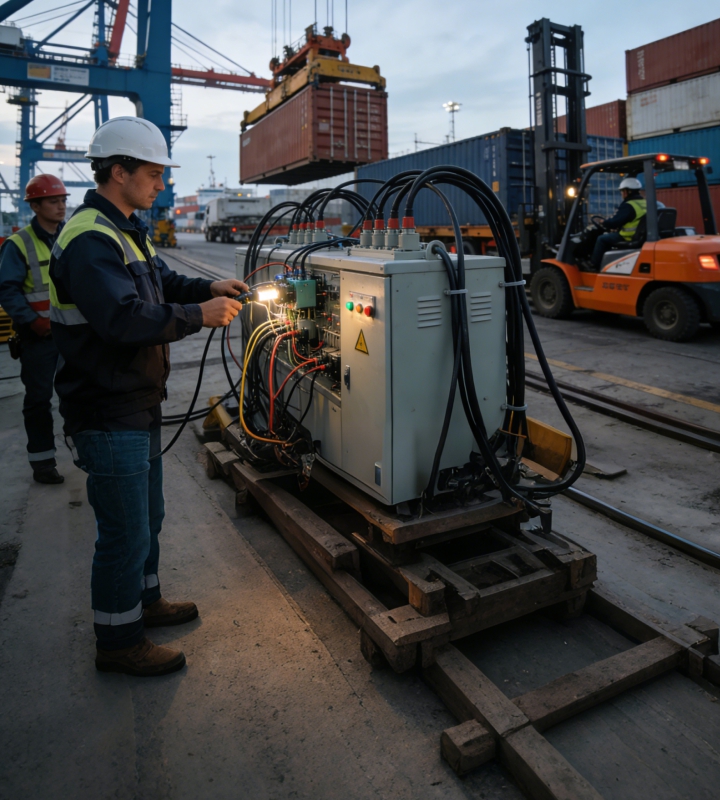 功能:为码头堆场的冷藏集装箱提供持续电力,维持箱内货物(如生鲜、药品)的低温环境。